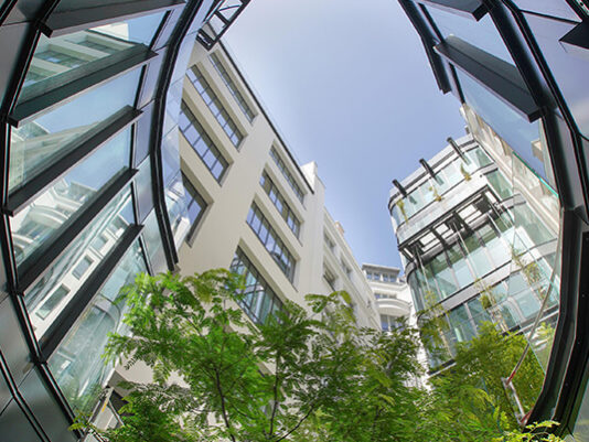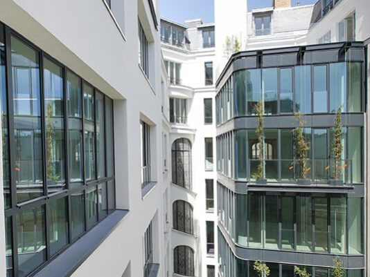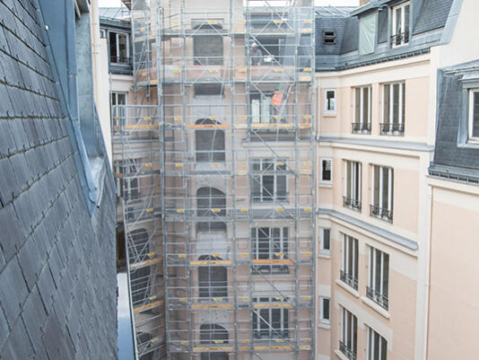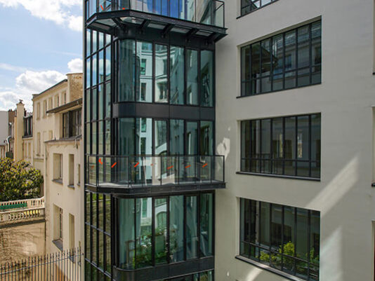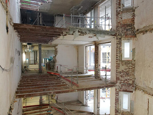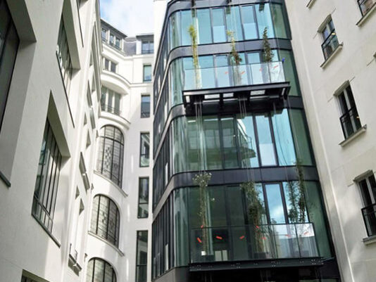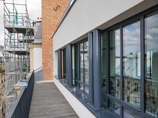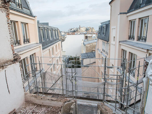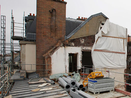 En superstructure, les besoins d’aménagement en bureaux modernes de cet ancien bâtiment a conduit à connecter et renforcer les planchers tant structurellement que acoustiquement, à remettre à niveau des planchers surbaissés, à déplacer les poteaux et à moiser les poutres existantes, à modifier des façades et à créer des extensions.