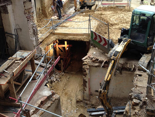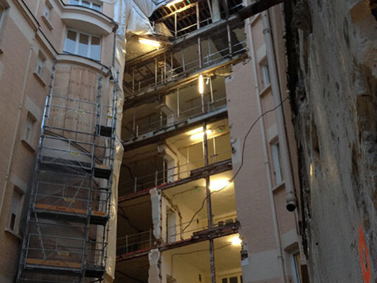 En sous-sol des reprises en sous-œuvre complexes et la création d’un niveau supplémentaire en infrastructure ont nécessité une cinquantaine de puits blindés et tout un réseau de poutres transferts de charge compris traversées dans les voiles existant par la mise en place de tabourets.