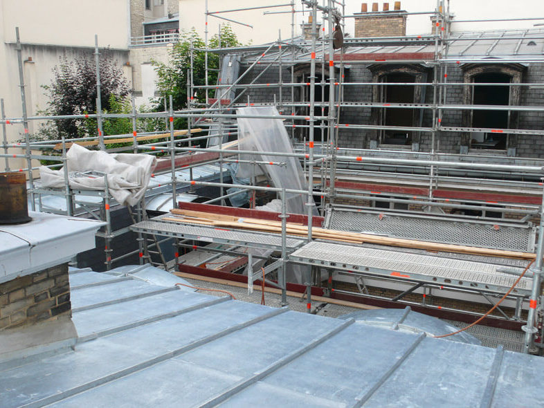 Immeuble privé de type Haussmannien en pierres de taille. Ravalement de toutes les façades par curage et gommage, réfection des couvertures en ardoise type Angers, remplacement des descentes EP en fonte cannelé, grenaille et peinture des serrureries et menuiseries, remplacement des verrières.