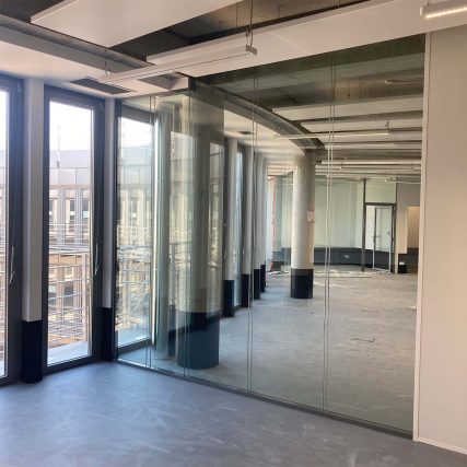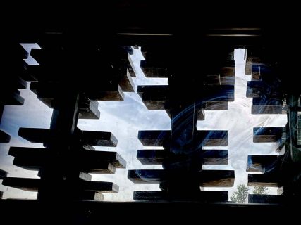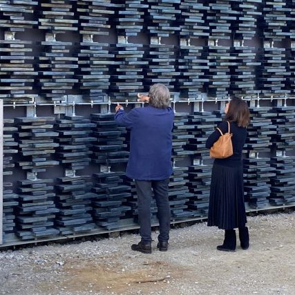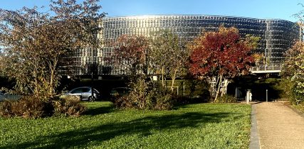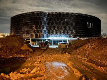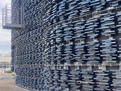 Délimité par deux cercles, ce bâtiment cylindrique présente, en son centre, un espace extrêmement lumineux mêlant acier et verre autour d’un patio végétalisé et en extérieur une enveloppe opaque unique au monde constituée de pavés en Basalte coulé montés sur une structure en inox, à formes variables qui offrent des reflets noirs bleutés variant de ton en fonction de la luminosité du ciel.