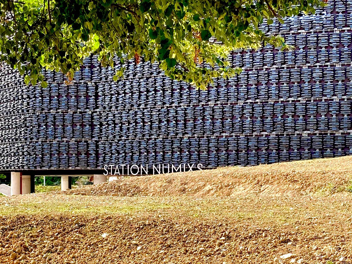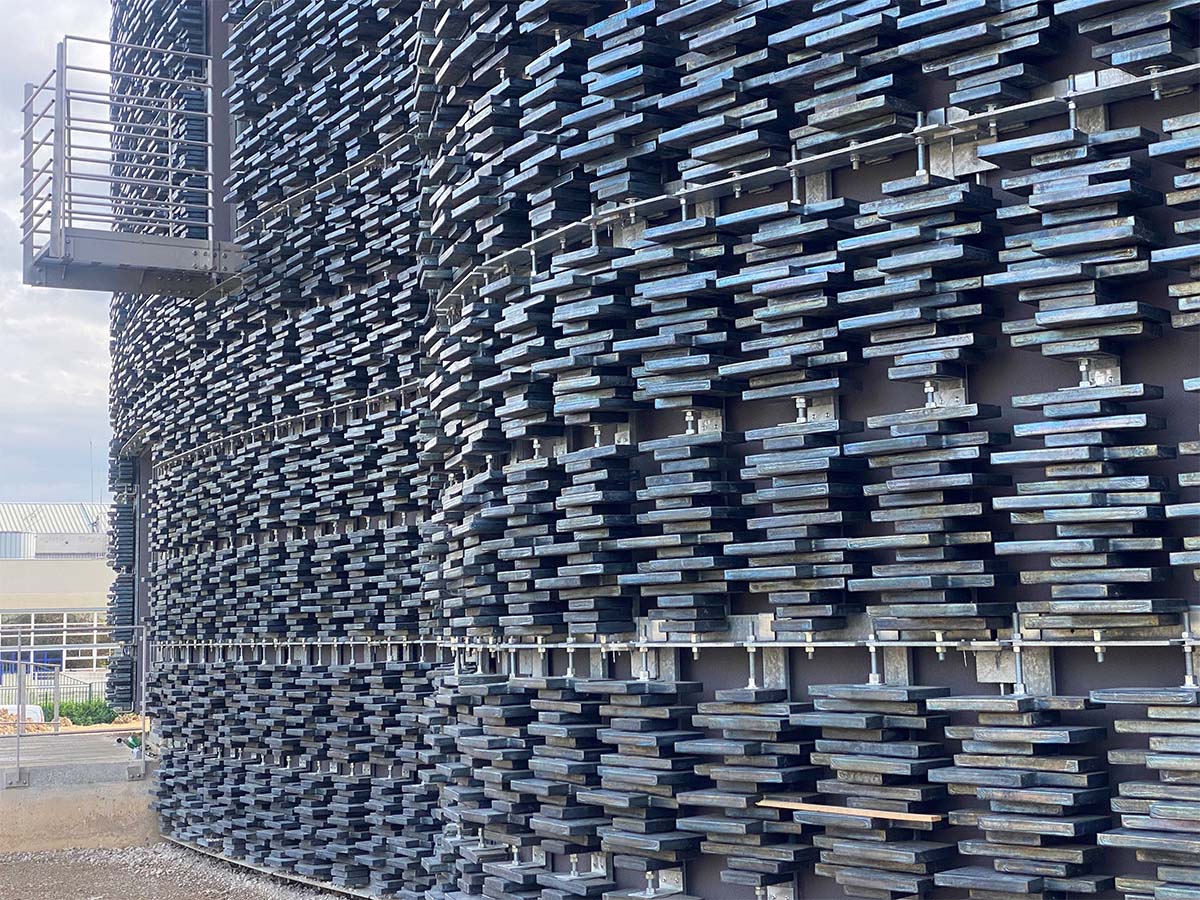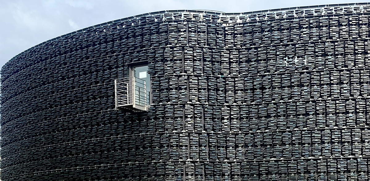 Délimité par deux cercles, ce bâtiment cylindrique présente, en son centre, un espace extrêmement lumineux mêlant acier et verre autour d’un patio végétalisé et en extérieur une enveloppe opaque unique au monde constituée de pavés en Basalte coulé montés sur une structure en inox, à formes variables qui offrent des reflets noirs bleutés variant de ton en fonction de la luminosité du ciel.