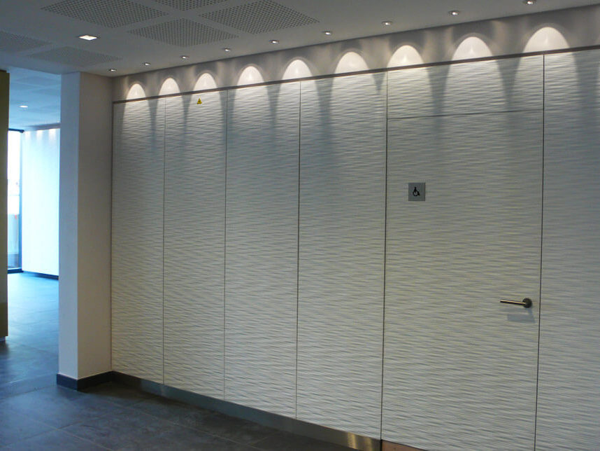 Curage et retrait d’amiante. Transformation de toutes les façades par la mise en place d’isolation par l’extérieur sous tôles laqués et mur rideaux vitrés sous profil à rupture de pont thermique. Equipement techniques de haute performance.