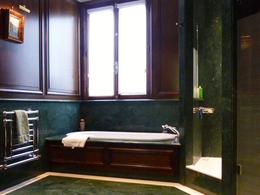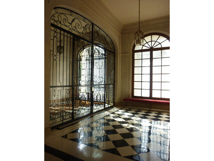 Haute prestation décorative : boiserie type Louis XVI, marbres calepinés, plafonds en staff mouluré sur mesure, tenture, peintures et patines décoratives et trompe l’œil, climatisation et sonorisation.