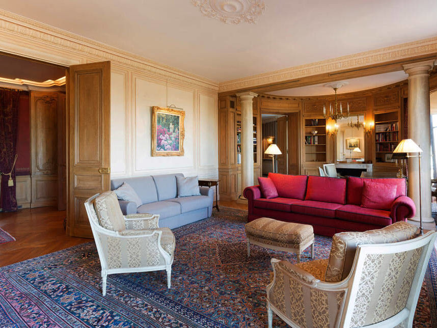 Réhabilitation complète après curage et décoration de style dans un appartement de prestige de 150 m2 face à la Tour Eiffel.